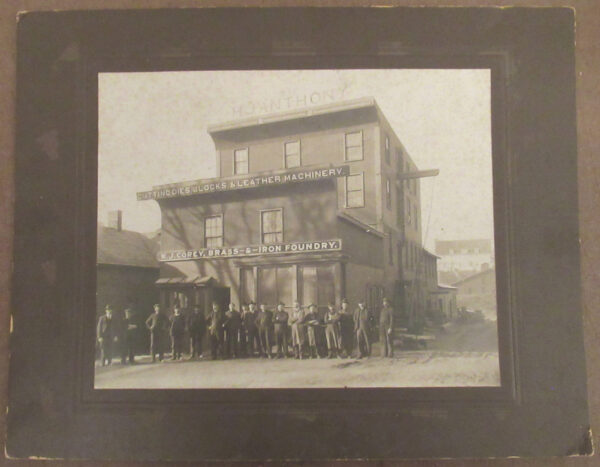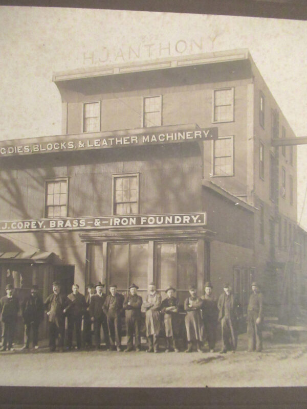 Description: This original early twentieth century photograph showcases a four story building housing manufacturers of glove and leather machinery, H. J. Anthony and W. J. Corey. A line of men stand in front of the building, ostensibly the employees who worked there. Large letters spelling “H. J. Anthony” stand at the very top of the building with additional signs reading “Cutting Dies, Blocks, & Leather Machinery” and “W. J. Corey, Brass-&-Iron Foundry” at lower levels on the facade. An 1898 Gloversville and Johnstown directory lists H. J. Anthony as being located on Cayadutta Street in Gloversville.
