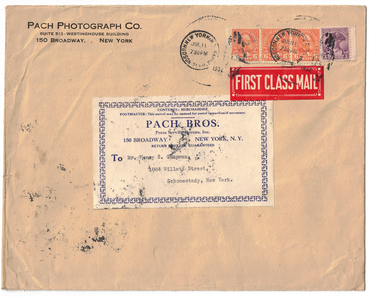 Includes the original transmittal envelope printed with the Pach Photograph Co.’s return address and a printed address label. Circular ink cancellation stamps indicate the photograph was mailed on July 11, 1932, near the end of Herbert’s term in office.