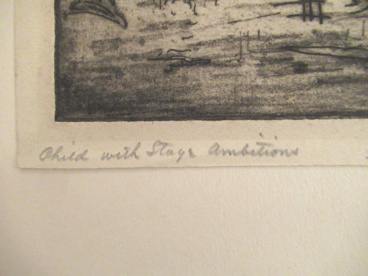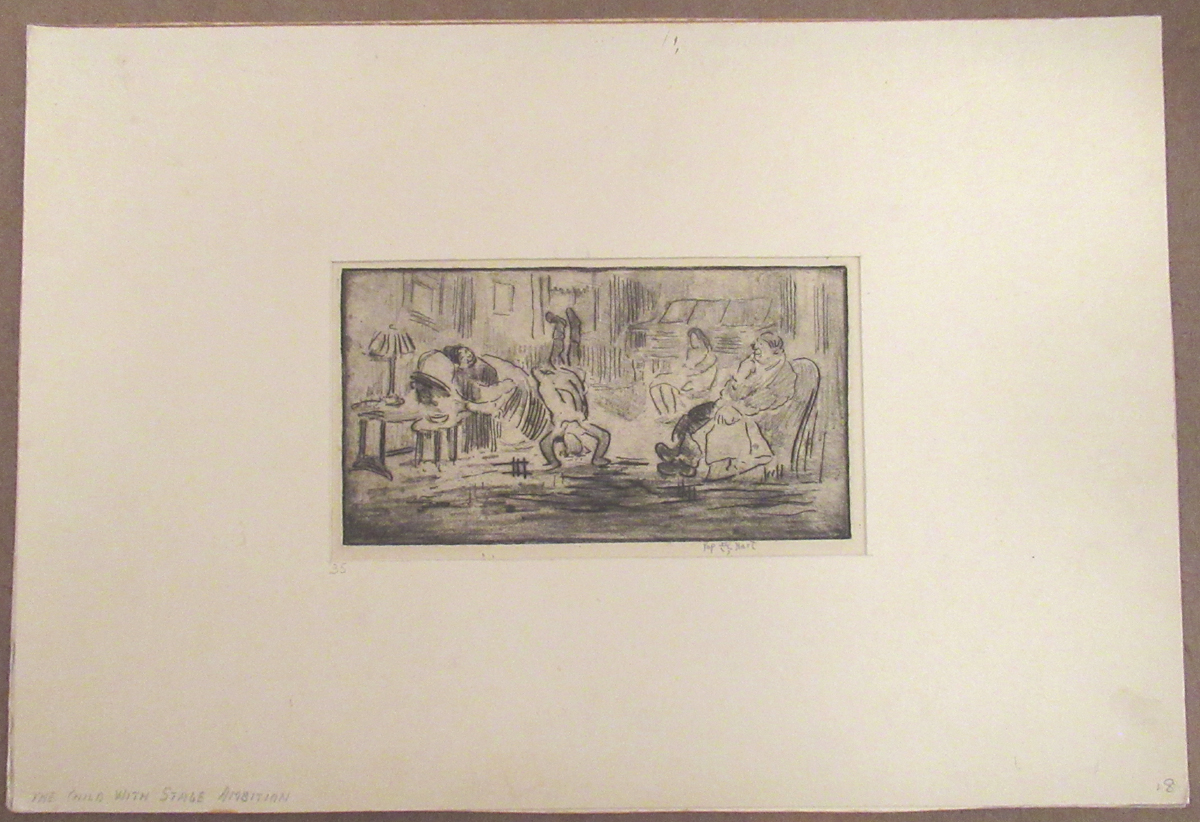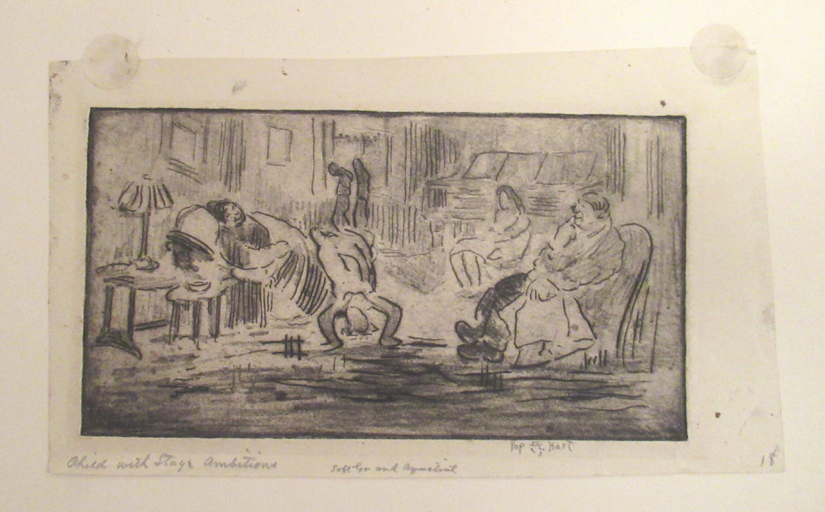 Description: This light-hearted image features several adults lounging in a living room being entertained by a youngster doing a handstand. Lower margin is signed in graphite “Pop Hart” and also states: “Child with Stage Ambitions” and “soft gr[ound etching] and aquatint”.