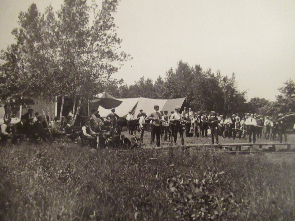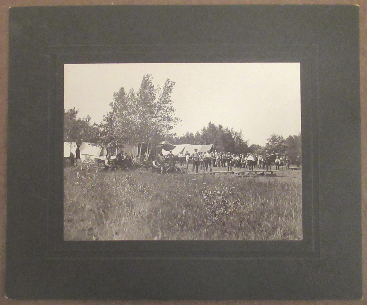 Description: This original early 20th c. black and white photograph features the meeting of a shooting club in a grassy field. A line of shooters holds rifles at the right of the photograph with clusters of other attendees, tents, and umbrellas in the background.