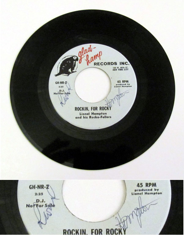 Description: This 7” 45 RPM vinyl record of “Rockin, for Rocky” by Lionel Hampton and his Rocke-Fellers is signed in ink by the renowned jazz musician. Hampton (1908-2002) was a skilled vibraphonist, pianist, percussionist and bandleader of the Lionel Hampton Orchestra. Benny Goodman, Louis Armstrong and Buddy Rich are just a few of the musicians he worked with. He was also a staunch Republican who served as a delegate to the Republican National Convention numerous times. Item #A00595.