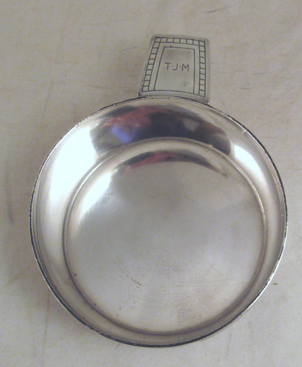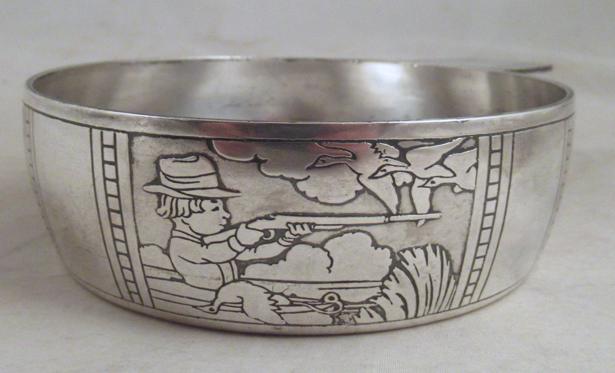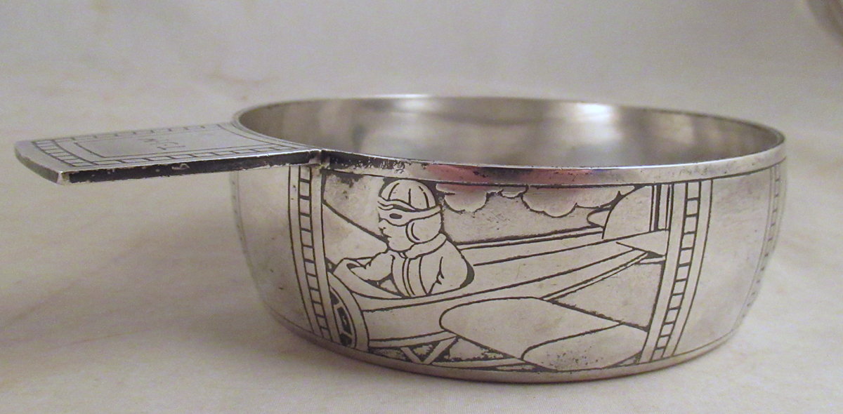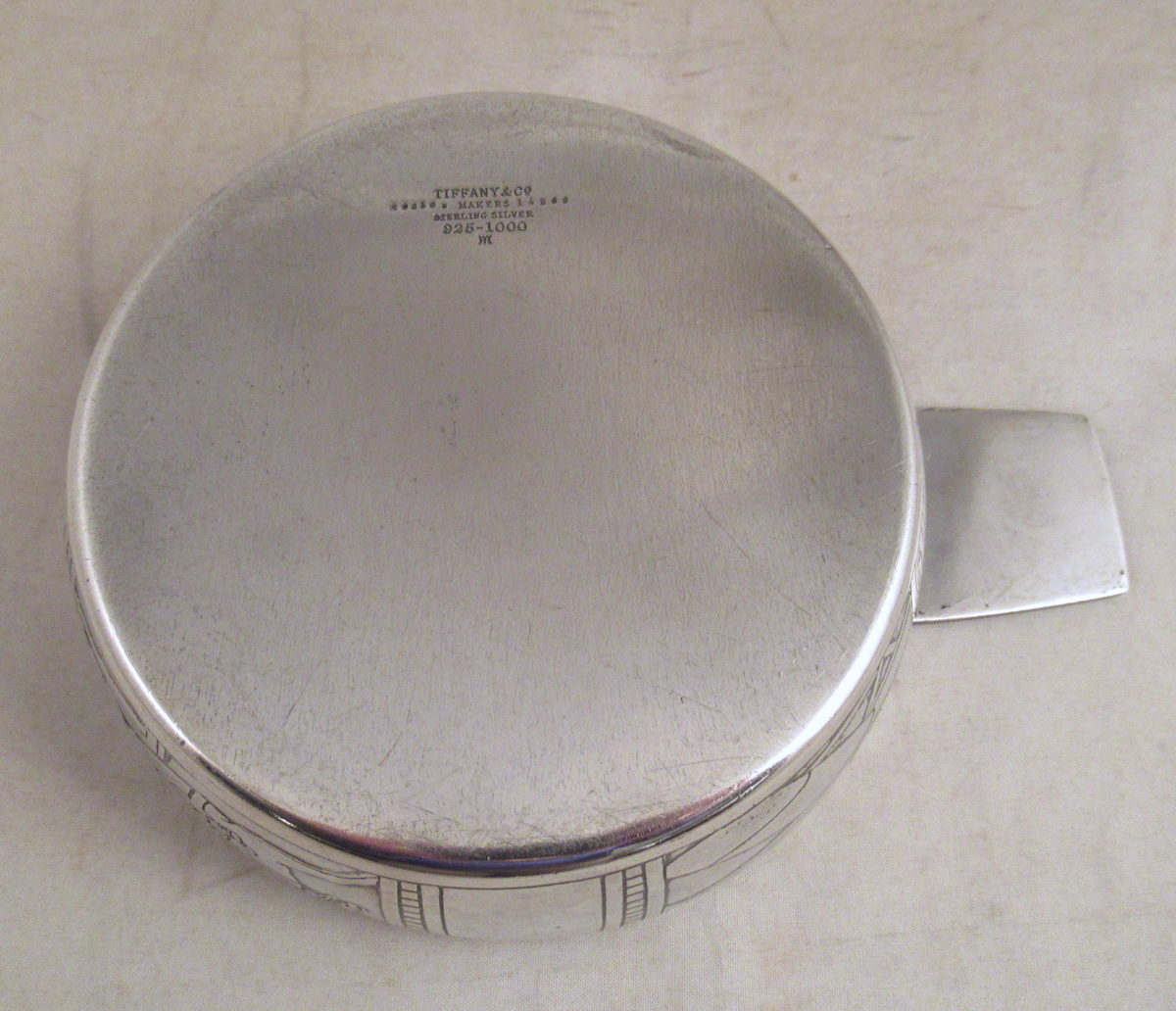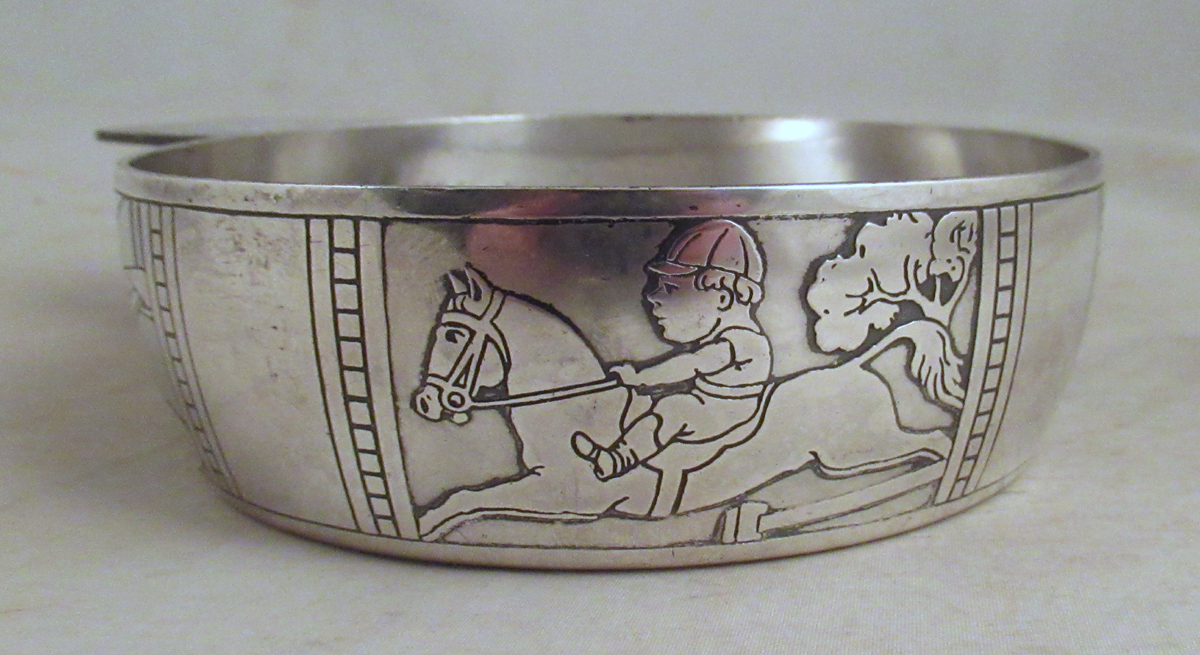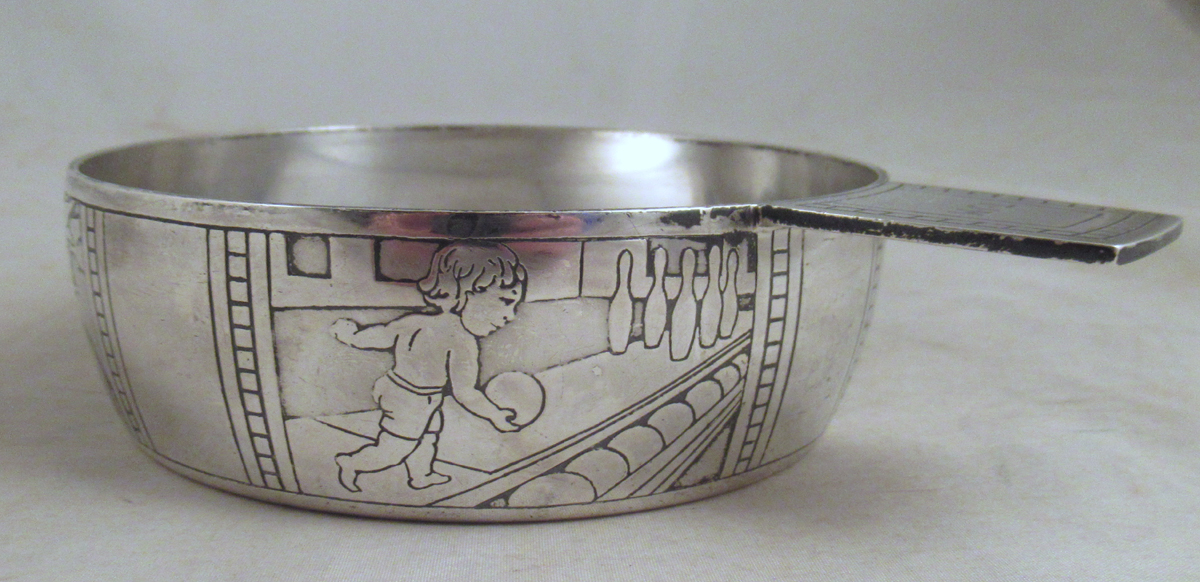 Description: This 5 ¾” diameter sterling silver dish designed by Tiffany & Co. features four jolly scenes of a young boy playing at various activities. He flies a plane, rides a horse, shoots a gun and goes bowling in the engraved images, each bound with a simple geometric border.