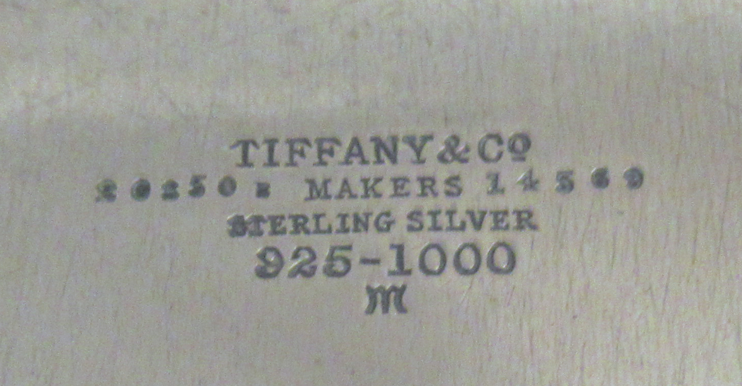 Underside is stamped: “Tiffany & Co 20850 B Makers 14569 Sterling Silver 925-1000” and has a stylized “M” as well