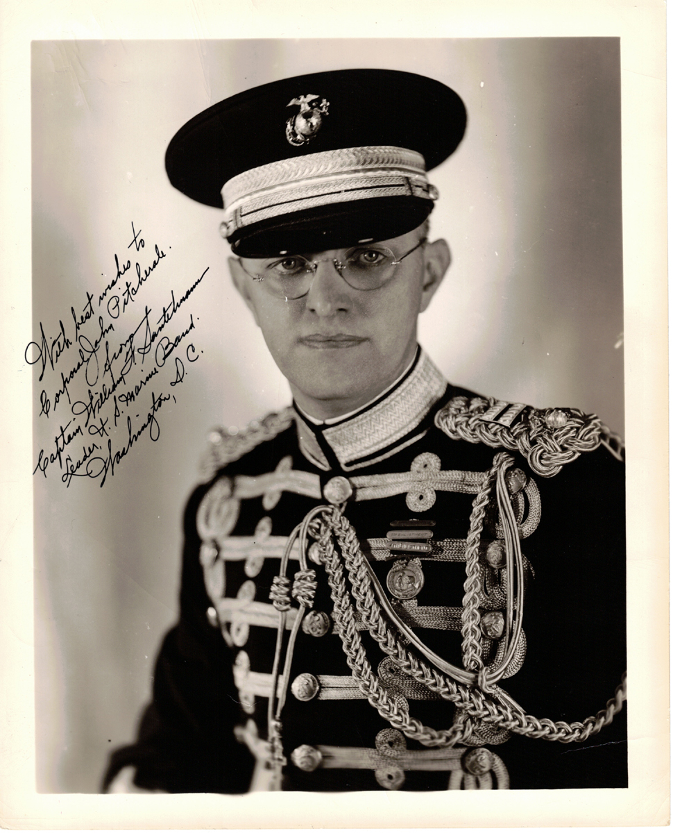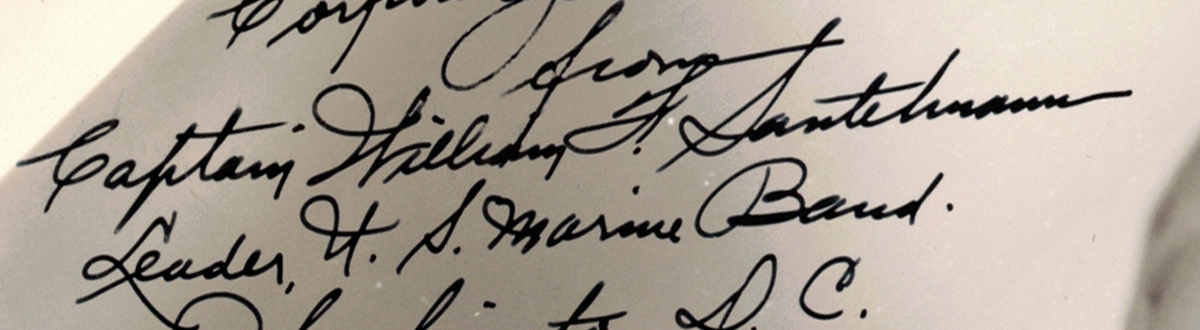 Description: Col. William H. Santelmann was the 18th Director of the United States Marine Band (1898-1927). His instruments were the violin, clarinet, and baritone horn. In this sharp, half-body, 8” x 10” image, he smartly faces the camera in full band regalia. Signed “With best wishes to Corporal John Pitcherale. From Captain William Santelmann. Leader, U.S. Marine Band. Washington, D. C.” in the mid-left blank space.